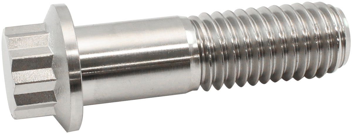 Aeroflow Performance Titanium 12 Point Head bolts, studs and nuts are machined from 6AL-4V grade 5 Titanium and the small head design is ideal when fitting into a recess or tight areas to give maximum clearance. These titanium bolts are the favored material for a fastener due to the attractive property of being a low-density metal, which has a higher tensile strength than many other materials, even in higher temperatures. Given this strength, titanium is remarkably light. When compared to steel in a strength-to-weight ratio, titanium is far superior, as it is as strong as steel but 45% lighter. In fact, titanium has the highest strength-to-weight ratio of all known metals. The pairing of their high strength to weight ratio, excellent resistance to stress corrosion cracking, high corrosion resistance and good fatigue strength make it the best choice to have in your race car. Each bolt is sold individually and available in a variety of threads and lengths to choose from.