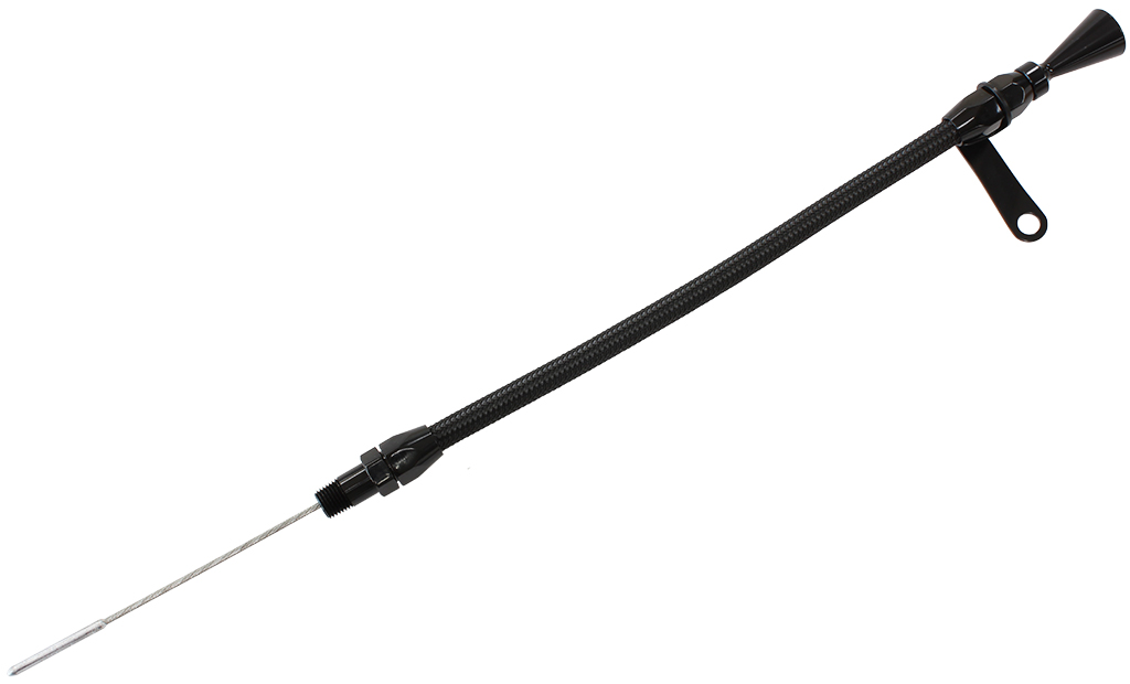 Aeroflow Performance universal engine oil dipstick is designed to work with oil pans that have a built in 1/4″ NPT fitting or can be used in any custom application with the use of a 1/4″ NPT weld-on. It has an overall length of 20.75″ (52.70mm) which can be cut down to suit most custom applications. Just likethe rest of our range of dipsticks it features 308 stainless steel braided covering over PTFE liner, billet handles and the double O-rings for extra security against crankcase gasses escaping. Available in chrome or black anodised.