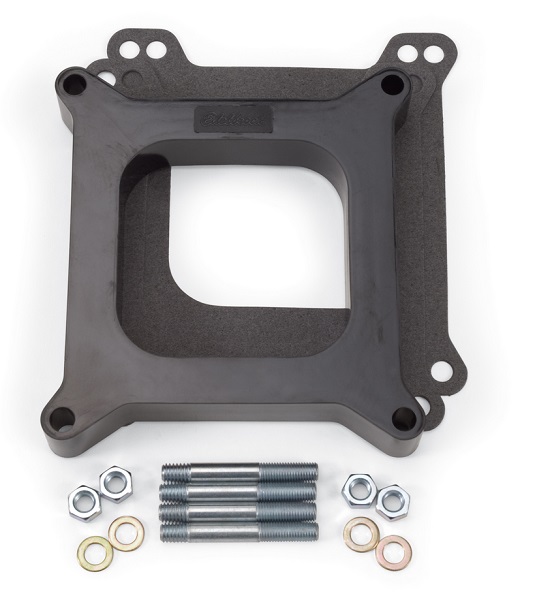 The Edelbrock Carburetor Spacer #8711 4-hole design enhances low-rpm torque and throttle response and dampen reversion effects on the carb. The Edelbrock #8711 4-hole spacer is 1″ thick and made of Black Phenolic Plastic.