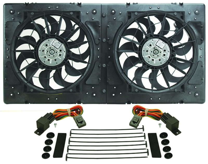 This high performance primary cooling fan kit combines two high output 265 watt motors with stator flow directors and an OE-quality injection molded fan shroud with pressure relief vents to produce one serious dual electric fan setup. Designed for puller applications, it’s perfect for muscle cars, street rods and heavy duty trucks, this combination produces 4,000 CFM while each fan draws 24.8 amps. Includes through the radiator mounting system.