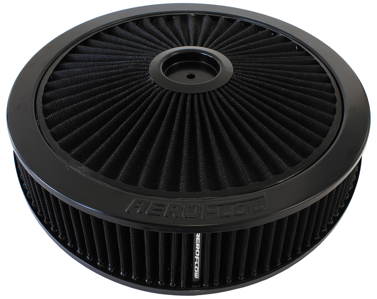 Stand out from the crowd with a magnificent looking Aeroflow air cleaner. These air cleaners are stamped from high quality steel. Available in many different great finishes and styles for that custom look you are after. Chrome-plated or black finish with reusable/washable or paper elements. Aeroflow air filter assemblies work with all popular standard 4150 (5-1/8″” / 130mm) carburettors and 4500 Dominator (7-5/16″” /186mm) carburettors. The 14″” (355.60mm) air filter assemblies come with a drop base that sits 1-1/8″” (28mm) below the carburettor.