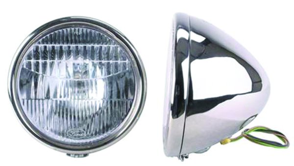 Show quality stainless steel headlamps. Headlights with Ford script logos are licensed by Ford Motor Company as an Official Licensed Restoration Product. Ford logos are on the lenses and buckets like originals. These headlamps feature 8-1/2″ diameter brass chrome plated reflectors, bulbs, correct glass lenses, lens gaskets, wiring, mounting nuts and a super bright polish. Boxed complete in pairs. Quartz halogen headlamps have 12 Volt halogen bulbs installed.