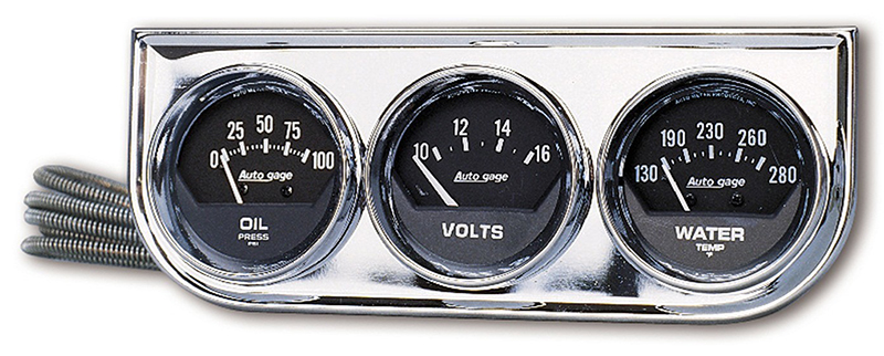 Auto gage series gauges come in popular sizes, single or multiple consoles, two colour schemes, black face with white accents and white face with black accents, and some with chrome trim. These gauges offer many economical options for street and street performance vehicles. Their electric gauges use a new rugged air core meter movement for maximum accuracy and quick response.