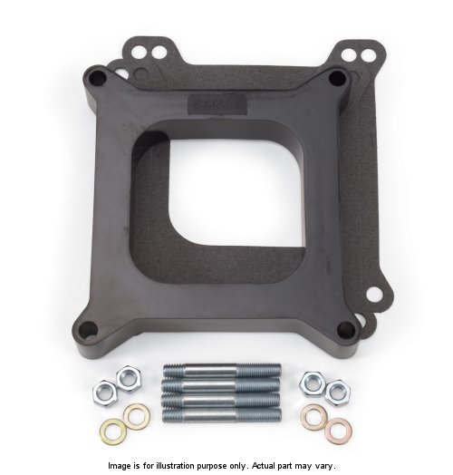 The Edelbrock Carburetor Spacer #8712 open design enhances low-rpm torque and throttle response and dampen reversion effects on the carb. The Edelbrock #8711 4-hole spacer is 2″ thick and made of Black Phenolic Plastic.