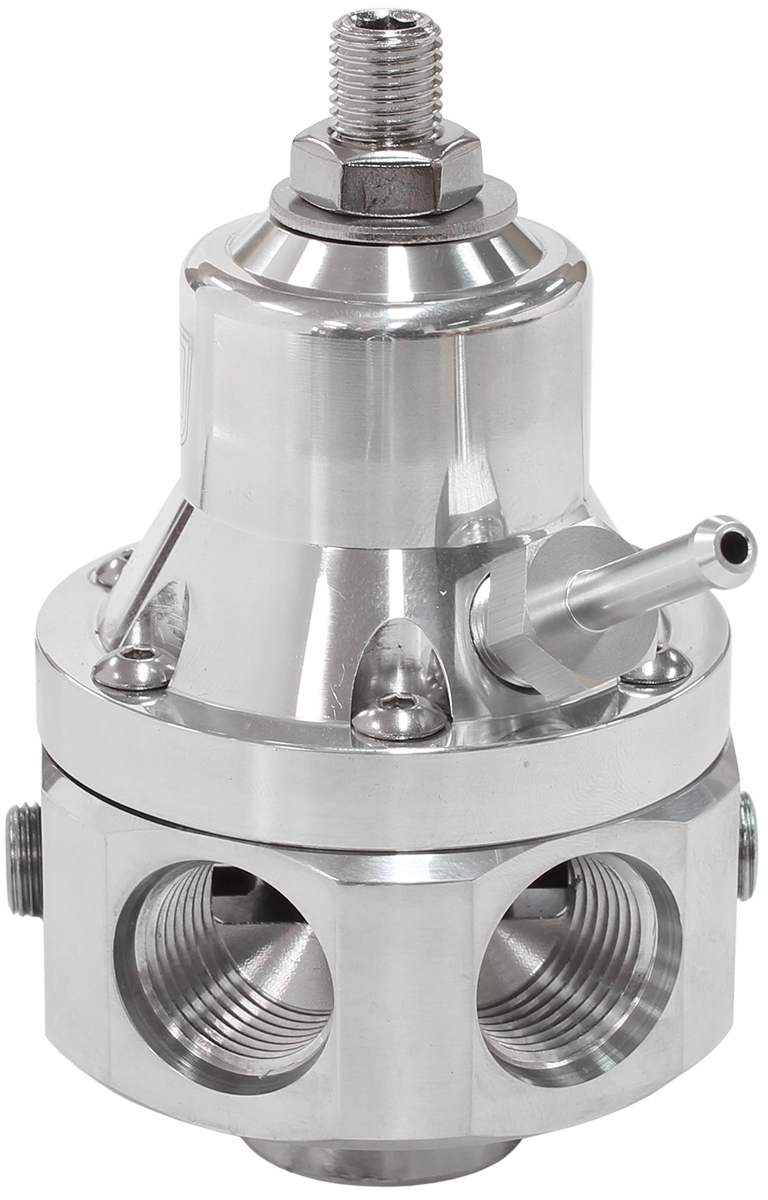 The Aeroflow Performance 4 port 2000hp efi fuel regulatoris designed to provide a stable platform for the high demands of all current fuel systems. With fuels such as E85, Methanol and alcohol based fuels this fuel regulator is an ideal upgrade to maintain a steady flow ratewith 4 x -8ORB feed ports, 1 x-8ORB return and 2 x 1/8″NPT for a gauge or pressure sensor to keep a watchful eye on fuel pressures. All whilst being completely rebuild-able and user service- able. Available in polished or blackfinishes. Adjustment from 35 to 85 psi 1:1 boost reference 5mm barb. Overall height is 100mm and overall diameter is 60mm.