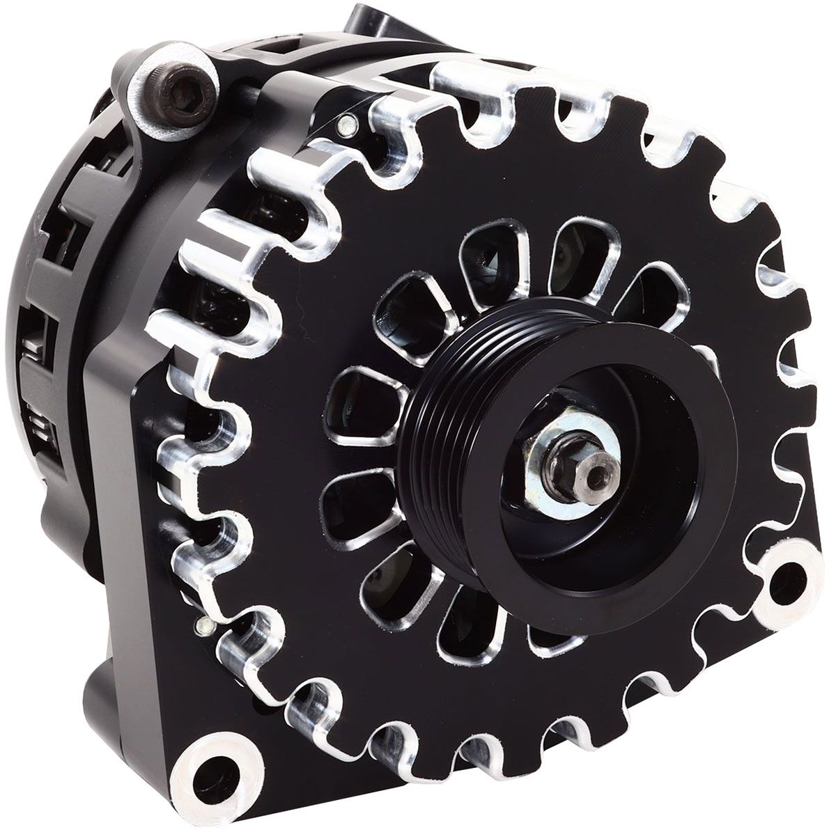 These Large Case billet units are the same housings we use in our iconic 370 and 400 amperage offerings. But with the larger 2.2″ 6 rib pulley(other sizes can be substituted upon request/application) it is much more at home in racing applications that require excellent charging at vehicle idle speeds while offering high rpm / above 5000 vehicle RPM capabilities while complimenting a show vehicle engine bay. If you are unsure if this application will meet your needs, please call us to discuss. Please have ready your vehicle’s crank pulley diameter, vehicle idle RPM’s and vehicle’s MAX RPM’s known for most precise results.
