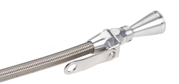 Flexible Engine Dipstick designed with billet aluminum handle to coordinate with Lokar’s Flexible Transmission Dipstick. Slim design allows mounting between header tubes. Designed for use with factory or block hugger headers. Applications available for GM, Ford, and Chrysler. E-Z to Read flexible inner dipstick measuring cable for accurate measure of engine oil.
