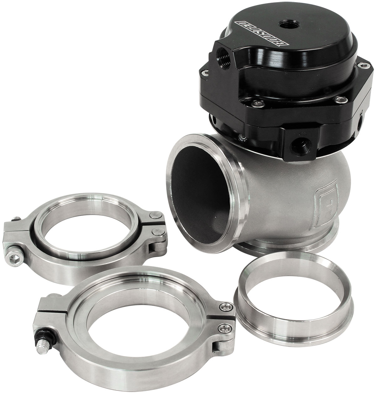 Aeroflow wastegates feature water cooling ports ( 2 x M8 x 1.0mm ) for those heavy duty applications. These are optional use and can be disregarded if not required. There are also 3 lower air pressure ports and two top air pressure ports ( 5 x M10 x 1.00mm ) for easy installation this eliminates the need to rotate the actuator top, plugs are included for unused ports. Aeroflow’s wastegates come preset at 1 bar. This can easily be altered by purchasing and installing springs from Aeroflow’s accessory range. The wastegate also includes required stainless steel hardware for installation including: valve seat, inlet V-band clamp/flange and outlet V-Band Clamp/flange.