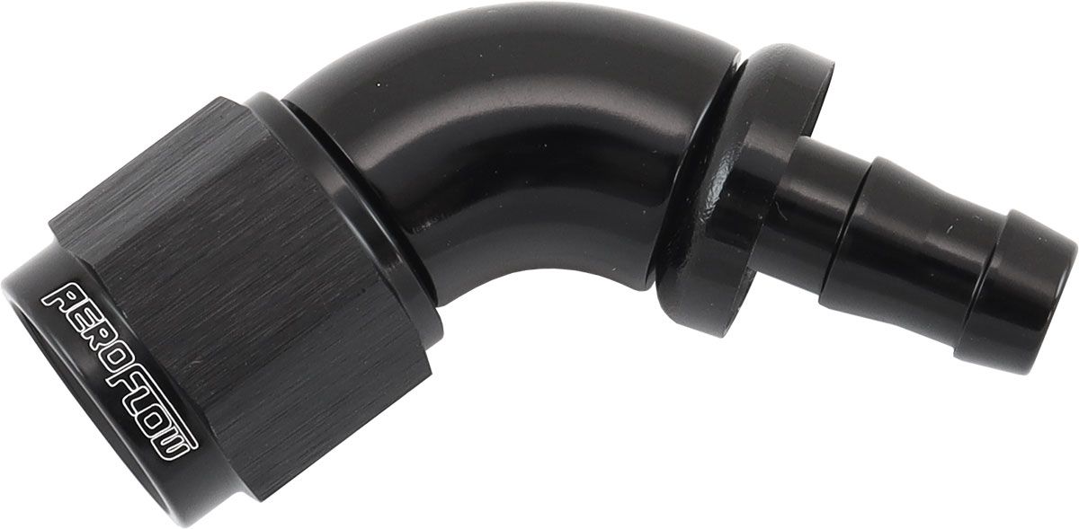 Aeroflow’s 510 series push lock fittings are a CNC machined one piece fitting which provide uninterrupted flow. The mandrel bent tight radius body has superior wall thickness with a custom designed barbed end to allow a quick, easy and leak free assembly. Aeroflow’s push lock fittings come with a purpose designed cover to hide the messy cut end of the hose to give you that professional look every time. Compatible Hose: 400 and 500 Series Push Lock hose (Blue and Black).