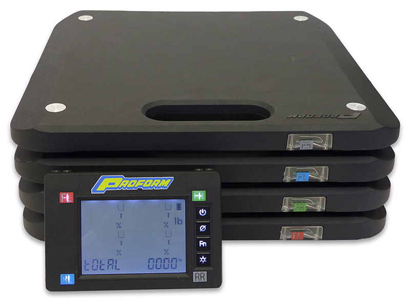 PROFORM’s next generation slim wireless vehicle scale includes NEW features! New features include full size 15″x 15″ slim aluminium scale pads (1 5/16″ thick), drive-upangle for easy setup, live stream data feed via USB cable(included) to computer with free downloadable program for viewing and file exporting, backlit LCD screen and controlbuttons, and a foam lined hardcase with wheels for storage. Standard features include an LCD display with Cross weight,Side/Side weight, and Front/Rear weight in addition to the standard weight and percentage for each wheel and total vehicle weight. The individual scale pads have a 1,750 lb. capacity per pad fora total scale capacity of 7,000 lbs. Scale is accurate to 1/10 of 1%. Scale pads are made of die-cast aluminium. Scale pads are made of die-cast aluminium, and finished in a durable black powder coat. AA batteries included.