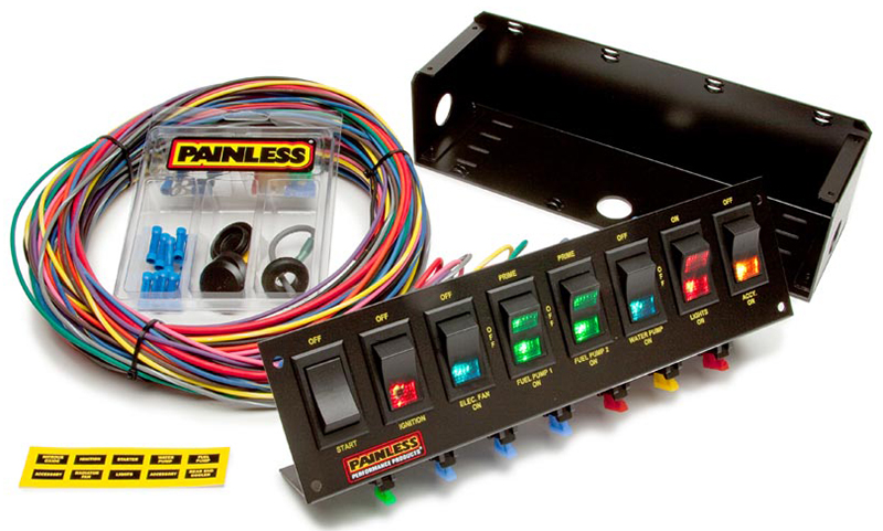 Heavy duty lightweight non-reflective housing designed to mount to a roll bar using a standard metal hose clamps. Lighted rocker switches are color coded for quick visual reference. All circuits individually fused and easily accessible for quick testing and replacement.Kit comes complete with 18 feet of TXL wire using machined applied, vibration resistant, fully insulated terminals. Kit controls: Start, ignition, electric fan,fuel pump #1 and #2, water pump, lights and one accessory.