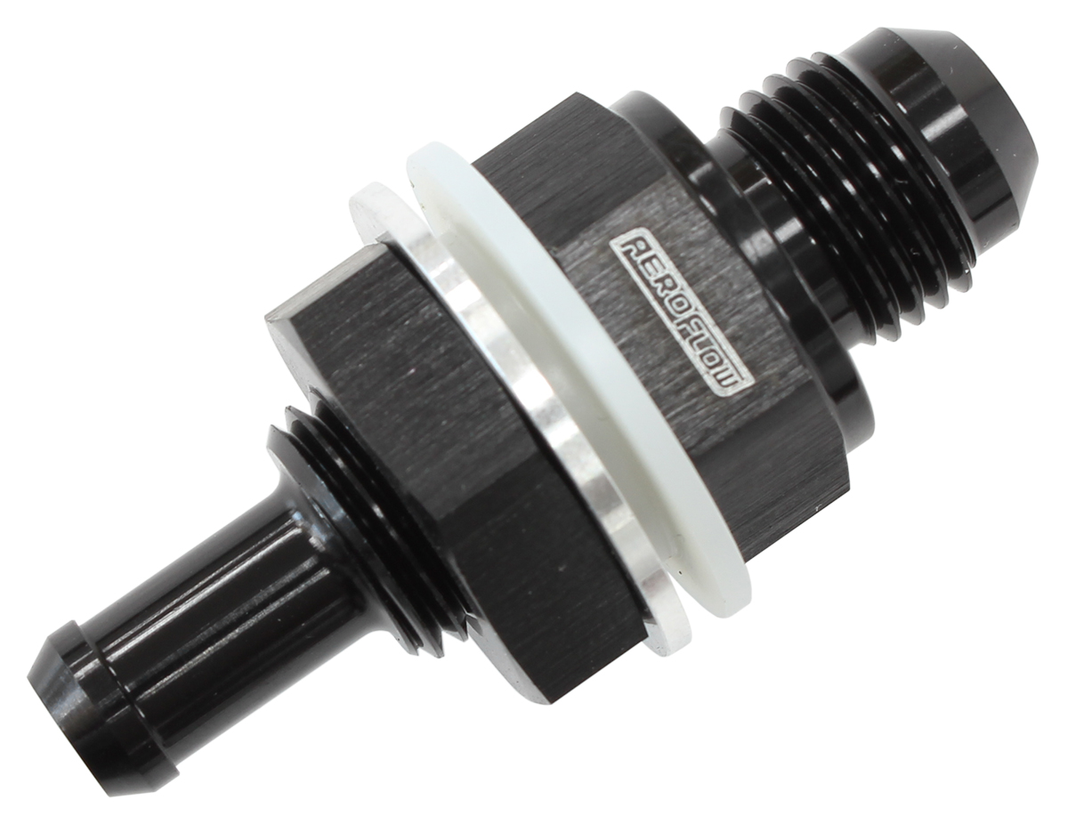 This Aeroflow Performance high flow bulkhead fitting is designed for use in fuel cells. They feature a radius on Inlet for unrestricted flow. Each bulkhead fitting includes 2 PTFE washers and a bulkhead nut. These fittings can also be used for adding a breather to a valve cover, or a drain on a fabricated tank whether it is a plastic or metal material.