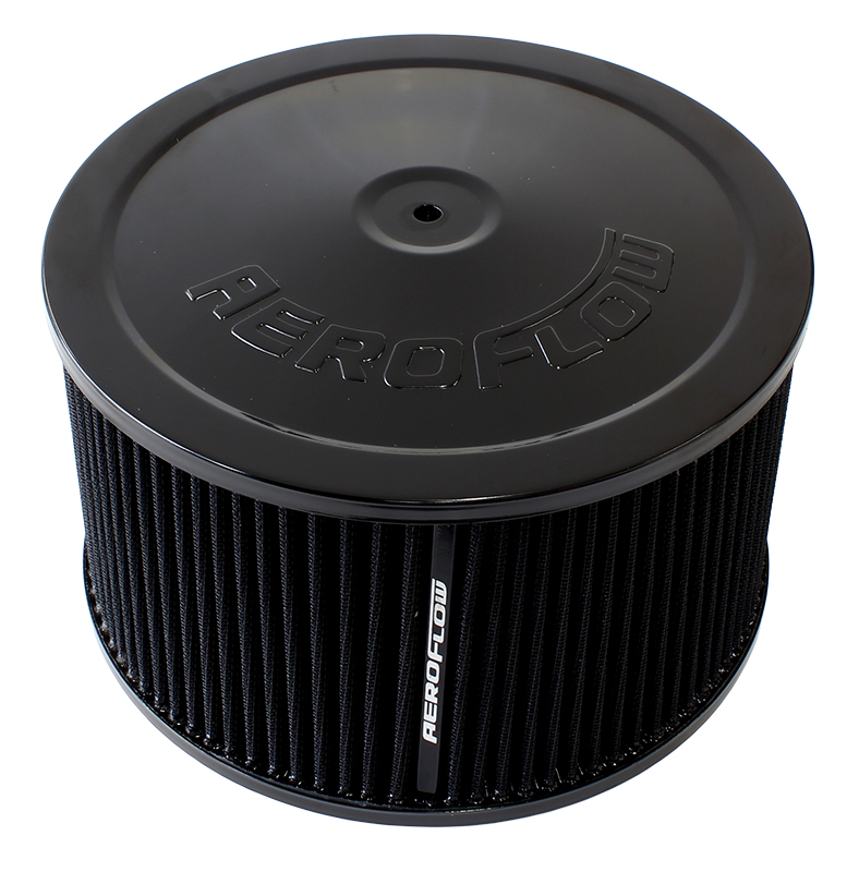 Stand out from the crowd with a magnificent looking Aeroflow air cleaner. These air cleaners are stamped from high quality steel. Available in many different great finishes and styles for that custom look you are after. Chrome-plated or black finish with reusable/washable or paper elements. Aeroflow air filter assemblies work with all popular standard 4150 (5-1/8″” / 130mm) carburettors and 4500 Dominator (7-5/16″” /186mm) carburettors. The 14″” (355.60mm) air filter assemblies come with a drop base that sits 1-1/8″” (28mm) below the carburettor.