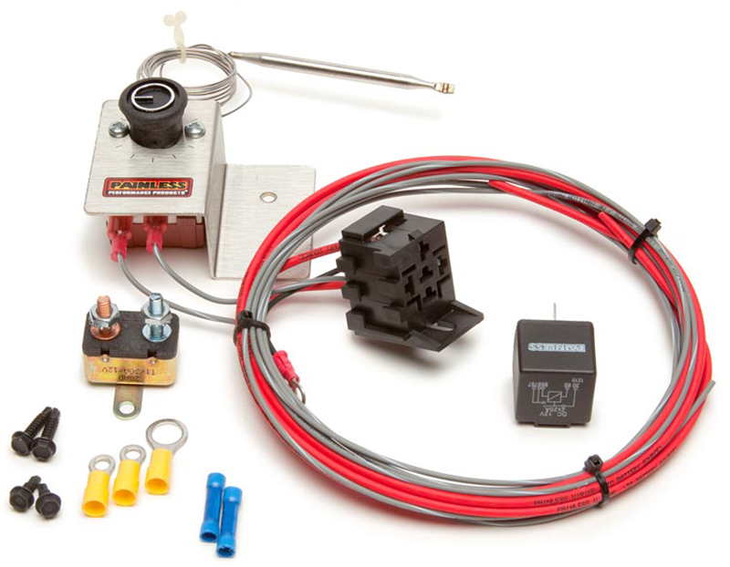 Designed to allow a wide range of temperature adjustments for your electric fan. A bulb at the end of the capillary tube is inserted in the fins or attached to the top or hottest portion of the radiator. Use the adjustment knob to set a precise temperature desired for fan activation. The strong brushed stainless steel mounting bracket looks great. Complete kit includes thermostat, bracket, 30 amp relay, 30 amp circuit breaker for overall protection, wiring, terminals and hardware. Note: Temperature refers to the temp of the capillary tube, not the coolant temp.
