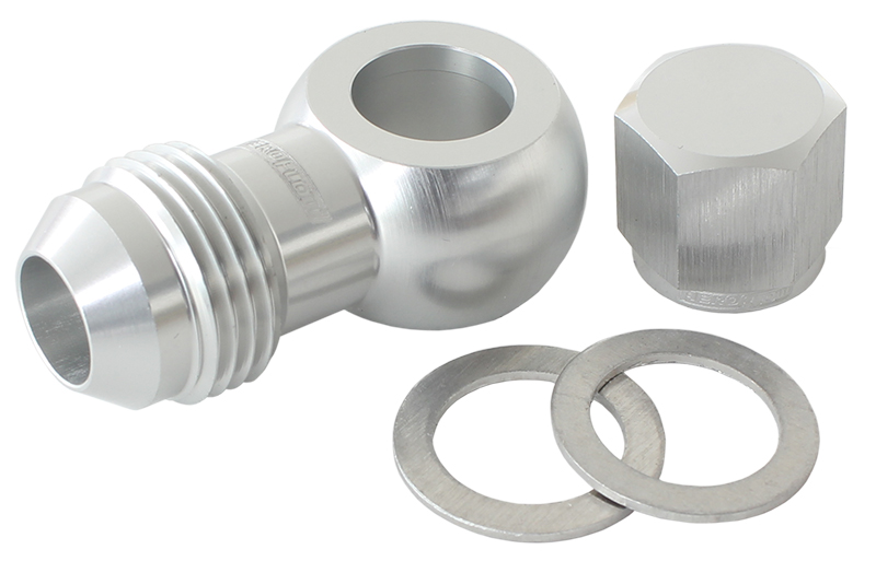 This banjo kit from Aeroflow offers a great cost-effective solution when fitting a Aeroflow 49-1014 or Bosch 044 style of fuel pump to your vehicle. It retains the one-way check valve that is included when you purchase this fuel pump brand new. It will allow you to run either a AN or hose barb from the inlet of the fuel pump at 90 degrees. This is a great way for those tight spaces or under car installations. Manufactured from 6061-T6 billet aluminium and available in blue, black and silver anodised finishes. Each banjo kit comes complete with banjo, cap end and washers.