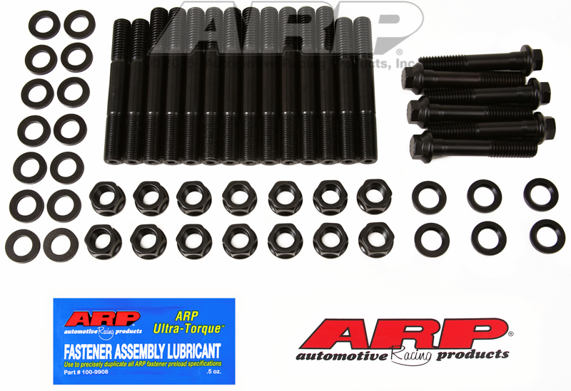There are many important reasons to use ARP main stud kits, including the elimination of main cap walk and fretting, as well as protecting the threads in your engine block. All kits come complete with hardened parallel-ground washers and high quality nuts. Some applications have provisions for mounting windage trays and have specially designed standoff studs with serrated lock nuts to position the windage tray and lock it securely in place. The studs are manufactured from 8740 chrome moly steel, heat-treated in-house to 190,000 psi tensile strength, and precision J-form threads rolled after heat-treat to create a fastener that has threads 2000% stronger than others.