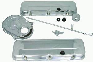 Chrome Big Block Chevy engine dress-up kit with short valve cover.