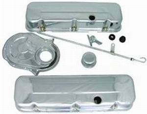 Chrome Ford 289-351W engine dress-up kit with tall valve cover.