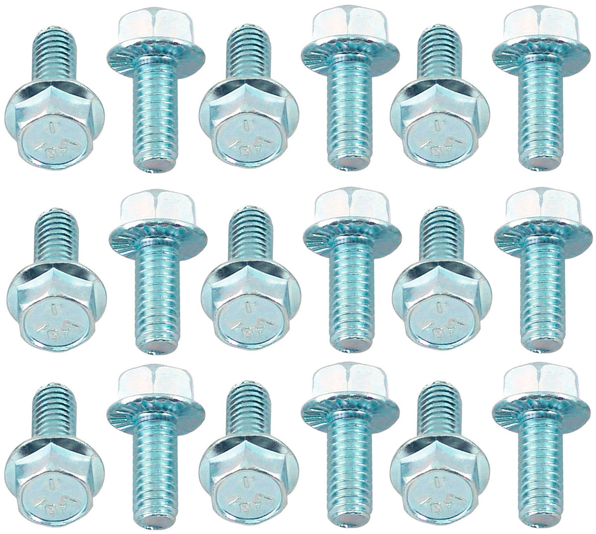 The special smaller-than standard hex head is ideal for tight spaces. Because of the hex flange head design, it will not fall back into the socket wrench, allowing for easier installation. Special under head serrations prevent loosening and the wide flange head distributes uniform clamping pressure for an Ultra gasket seal. Bolts are zinc plated, Grade 5.