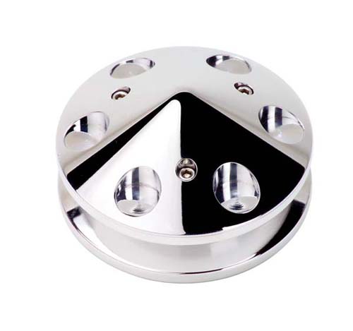 Machined in the USA from 6061-T6 billet aluminum this Billet Specialties one piece alternator pulley features a bolt on nose cone to hide the alternator nut and washer. Fits most GM, Delco, and Ford alternators.