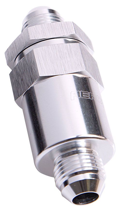 Aeroflow’s fuel filters are CNC-machined from billet aluminium with a removable bronze element and are available with either AN fittings or hose barbs.