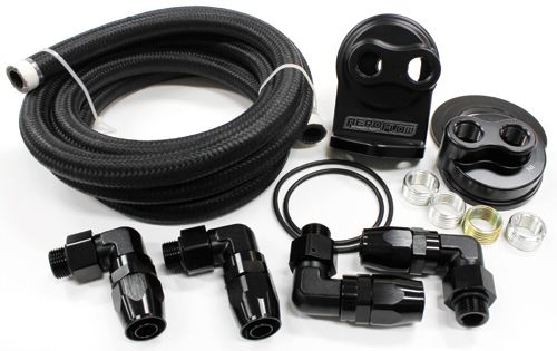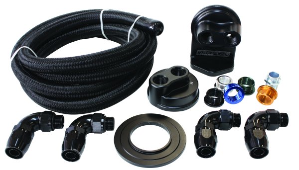 The relocation kit contains a billet remote blockadapter (AF64-2076) to convertthe stock filter landing to anoil passage on the engine block. A billet remote single filter head to mount a single oil filter (AF64-2075). For the universal plumbing we include 2.5 metres (8.2ft) of -10AN 450 series braided hose for custom fit oil lines and 4x anodised black aluminium 90-degree -8ORB to -10AN hose fittings. These one-piece fittings eliminate messy sealants, thread tape and the chance of cracking the housingdue to over tightening.
