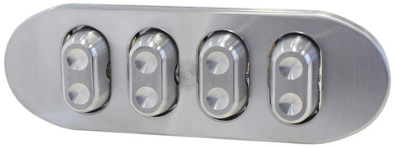 4 of our Billet 3-wire rocker switches mounted in an Oval billet frame that’s 4-7/8″ wide by 1-5/8″ high. Use as a driver door control for power windows on a 4-door or as a stand-alone console switch centre. NOTE: This panel is sold without relays or polarity reversing module(s), AT LEAST ONE ADDITIONAL REVERSING MODULE will be needed when using this panel with other of our Oval Billet Power Window Switches.