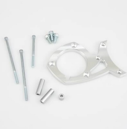 Precision CNC machined from solid billet 6061-T6 aluminium to fit perfectly and handle high torque and vibration. Kits comes complete with stainless steel tensioning rods and chrome moly rod ends for high performance operation. All necessary hardware included. ULTRA and DELUXE have clear powder coat, LOW COST CUSTOM has silver powder coat. If used with standard rotation water pump use ford racing pump # M-8501-G351 or 1985-87 crown vic alum. water pump. P/S brackets will not work with factory a/c brackets