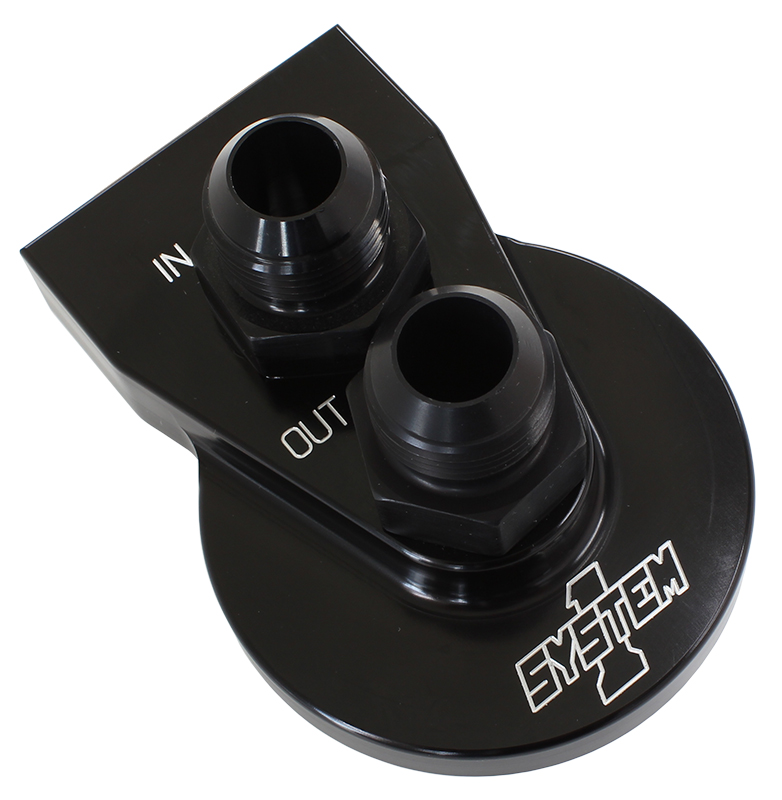 The flat mounting surface has two 5/16-18 bolt holes on a 2″ center to provide secure attachment and accommodate 3-3/4″ and 4″ diameter System 1 filters with no threaded adapter required. Available in red or black anodized finish and with choice of AN-8, AN-10 or AN-12 fittings.