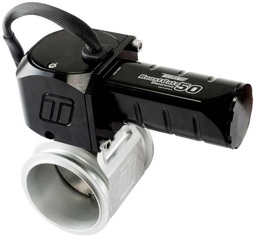 Turbosmart BoostGate50 is an electronically controlled butterfly style valve designed for charge pipe boost control. The BoostGate50 is manufactured from Billet Aluminum for reduced mass and features the kind of control and flow you’ve come to expect from the StraightGate series of Turbosmart products. Unlike a traditional external wastegate which bypasses gas around the turbine housing aiming to reduce turbocharger shaft speed and effectively, boost levels – Charge Air control is a controlled bleed of the compressed air on the cold-side of the turbocharger system. Mounted to the charge pipe, the BoostGate50 can be used to modulate this air flow directly, rather than the indirect method of traditional control.
