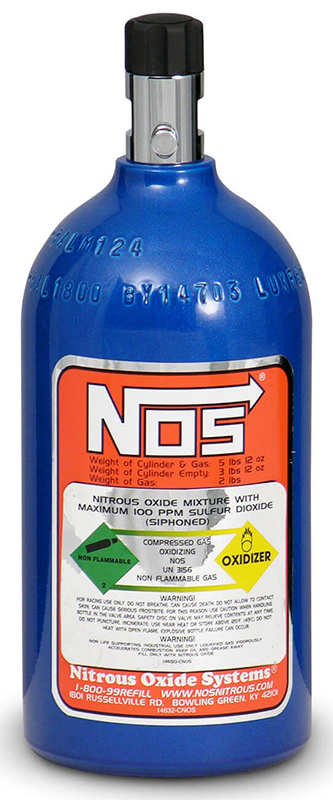 NOS offers nitrous bottles in a variety of sizes and finishes to suit your needs. The bottles come with an NOS/CGA-approved high-flow valve and built-in siphon tube. For extra safety, NOS has designed an exclusive blow-off venting system. If your bottle is overfilled or if pressure increases beyond the maximum safety level, the vent opens and discharges the nitrous into a safe place.