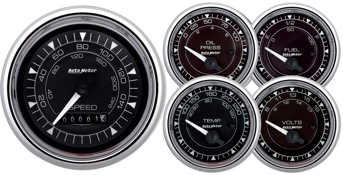 Convenient and cost-effective kit includes short sweep electric fuel level, oil pressure, water temperature, and volt gauges with full sweep electric speedometer