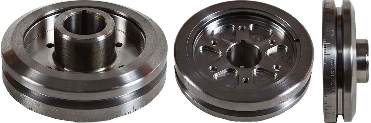 Steel Inner Hub / Steel Outer Ring, for Mild Street, Strip performance engines that offer increased harmonic absorption over stock units. Most have 360 degreed outer rings and are similar in weight to factory cast units but with the safety of an encapsulated outer ring. They are available in External or Neutral balance. They weigh from 3kg to 5kg. The RPM ranges up to 8500.