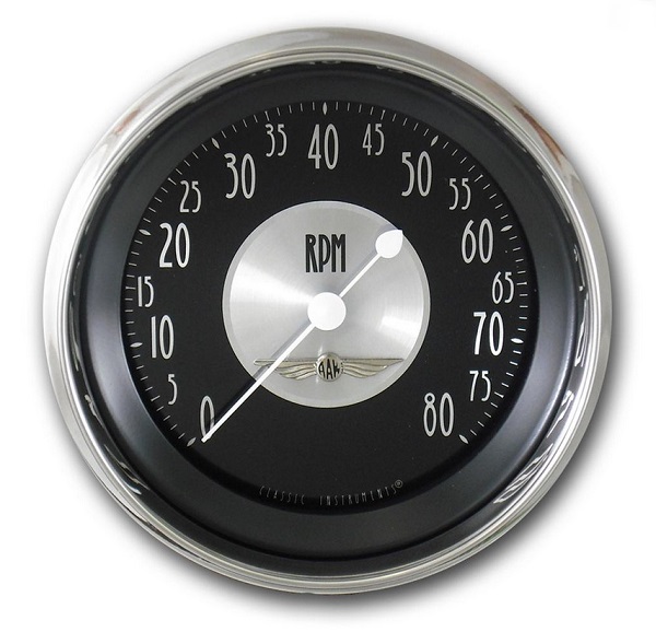 The face of this instrument features a spun central point with a black background which allows the polished aluminium numbers and indices to radiate off the face. This series is offered standard with polished stainless high stepped bezels and curved glass, the white teardrop pointers and elegant “All American” emblems complete this masterpiece. Tom Gale has once again collaborated with the team at Classic Instruments with wonderful results.