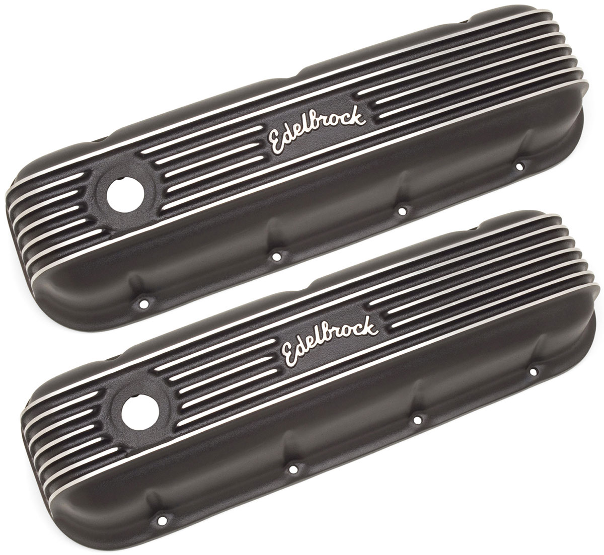 Edelbrock first made these aluminium valve covers in the late ’50s and they’re still a classic. Made of heavy-gauge sand-cast aluminium, our classic finned valve covers are available in either a classic polished aluminium or durable black powder coated finish. Overall height is measured from base to top at the highest point. Edelbrock classic valve covers can be machined to accept breathers if desired.