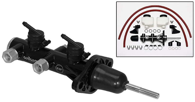Wilwood’s new Remote TandemMaster Cylinder w/ Pushrod is available in 4 bore sizes 7/8″, 15/16″, 1.00″ and 1.12″ and in two finishes: ball burnished and black e-coat. They’re designed for mount flanges from 3.22″ to 3.40″, common measurements for most domestic cars and trucks from the mid-1960s to present, and offer fluid outlet ports on both sides of the bore. The stroke is set at 1.12″ with a volume ratio of 2:1 between the primary and secondary chambers. Machined from high-pressure die castings, each master cylinder weighs only 3lbs, a 75% weight savings over most cast iron OEtype master cylinders. We alsooffer our combination proportioning valve kit, whichincludes brackets and stainless lines specifically for use with these master cylinders, see PN 260-14248 for a retrofit kit.