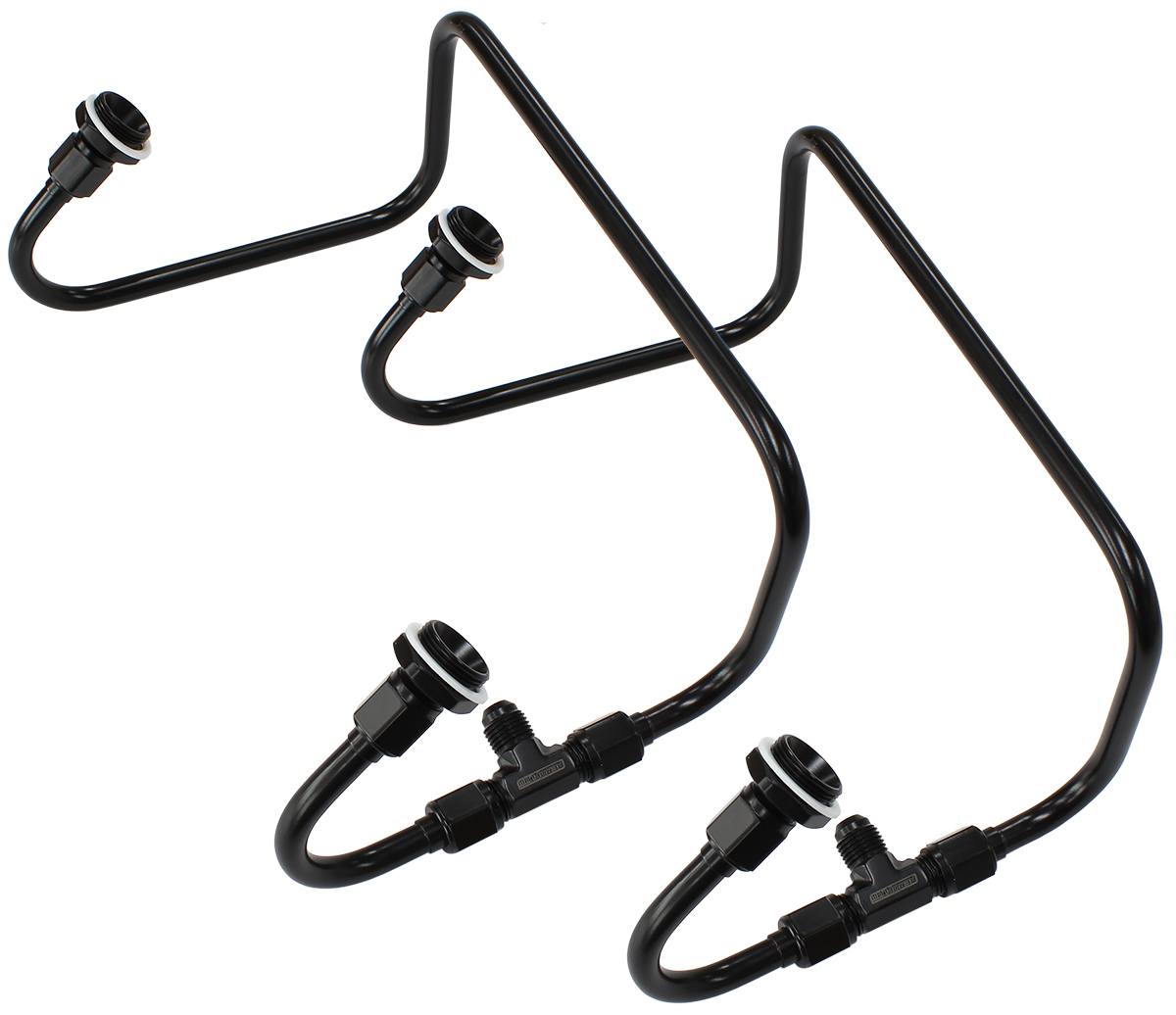 Aeroflow show finish dual inlet fuel line kit has 3/8″” polished seamless stainless steel tubing with polished stainless steel fittings for two Holley double pumper carbs mounted sideways. The kit includes Holley carb 7/8″”-20 fuel inlet to -6 AN fittings and provides a single fuel connection per carb to supply fuel to both carb bowls. Works on tunnel rams and blower setups