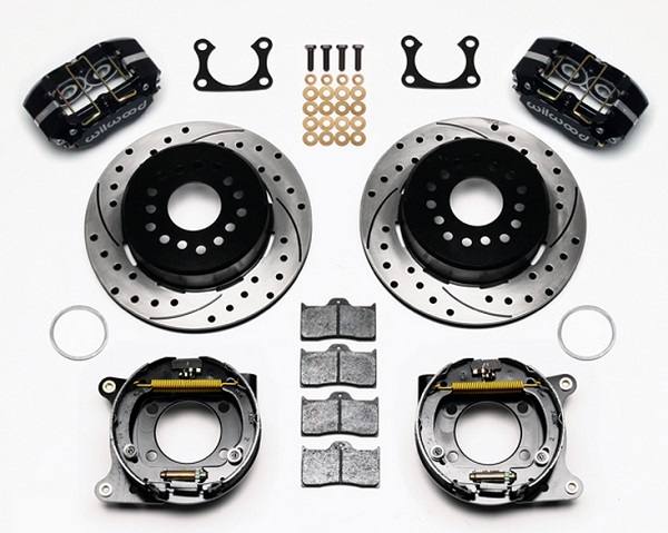 DP-DB Pro-Series rear disc kits provide a complete solution for popular muscle car rear axles that require a parking brake. Dynapro Dustboot calipers, 12.19″ one-piece drum/rotors, and high friction pads provide optimized and balanced braking for all types of custom performance street/strip and show machines. These kits were developed for applications or locations that require or prefer a dust-sealed piston. Dust-boot sealed aluminium pistons provide added protection against road or track born dirt and debris on low to intermediate temperature range applications that may also operate in harsh environments. The neatly hidden internal shoe system provides a clean installation with superior static holding power for parking. Optional caliper finishes and rotor designs enable the builder to personalize the style and optimize brake performance for every individual application.