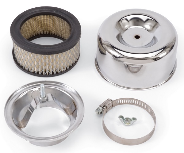 Edelbrock #1202 is a 4.65″ round chrome plated steel air cleaner for a single two barrel carburetor with a 2.63″ OD air horn such as the Edelbrock 94, Holley 94, Stromberg 81 and 97, and Demon 98. Includes is a paper element and all mounting hardware. Air Cleaner lid is smooth. Overall height is approx. 3-1/8″.