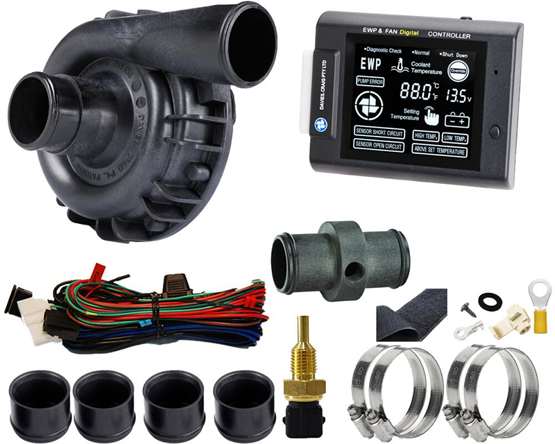 The EWP115 and LCD EWP & Fan Digital Controller Combo – simple, do-it-yourself, easy to install, designed to complement or replace your existing belt-driven, mechanical water pump and engine thermostat. The EWP115 will fit most vehicle makes and models fitted and excel onlarge six-cylinder, V8 engines. The LCD EWP & FanDigital Controller is scientifically calibrated to manage the flow rate of enginecoolant to lock onto a targeted engine temperature.