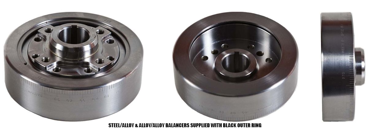 Steel Inner Hub / Alloy Outer Ring, for very Hi Performance Street, Marine or Race engines requiring the added insurance of a Steel Inner Hub for strength where dry sump pumps etc. may be installed. Romac recommend this style of balancer over all other balancers we produce due to its flexibility and endurance characteristics. Weight savings of approximately 1/3 less can be achieved with this style of balancer over our steel units and factory units. Available in External or Neutral balance. RPM range 10,000. Weight from 1.8 to 3.5kg’s
