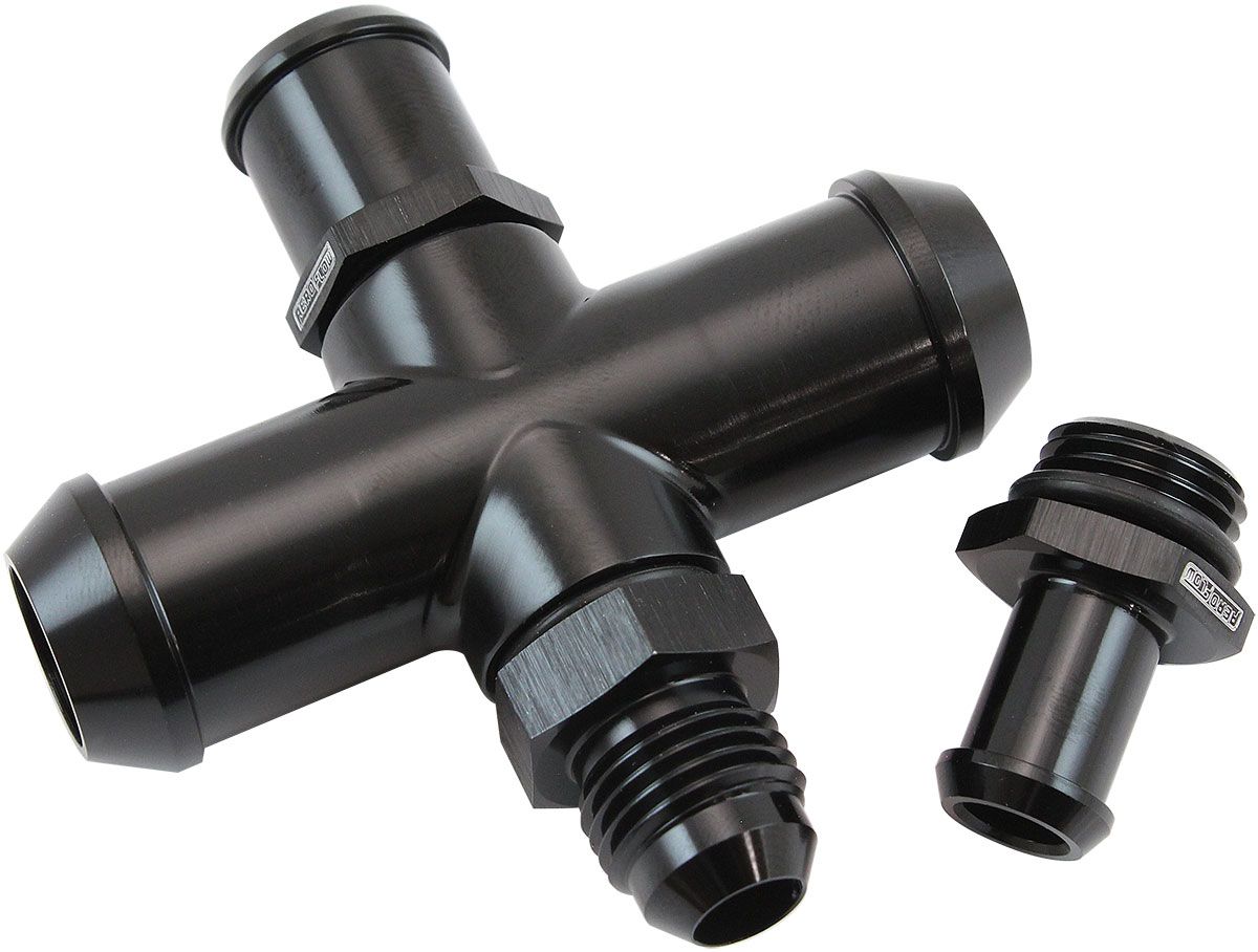 The plastic heater hose t-piece found in the Ford Falcon BA-BF and FG Barra engine is notorious for breaking down and causing engine coolant leaks. This is due to the brittle nature of the plastic over time breaking down. Being a discontinued item from Ford, Aeroflow Performance has made a new billet aluminium version to combat this problem. Made from billet 6061 aluminium and black anodised for corrosion protection. Both inlet barb fittings are 3/4″ on each side of the tee piece. With a 3/8″ barb and 5/8″ barb to -6ORB fittings are included to choose which model you have to suit on the side of the tee piece. An additional -6ORB is located opposite to the other -6ORB to create the X piece. A -6ORB to -6AN fitting is included. This will allow NON-TURBO barra engines to be converted to turbo and allow you to run a custom coolant water line to the turbocharger.