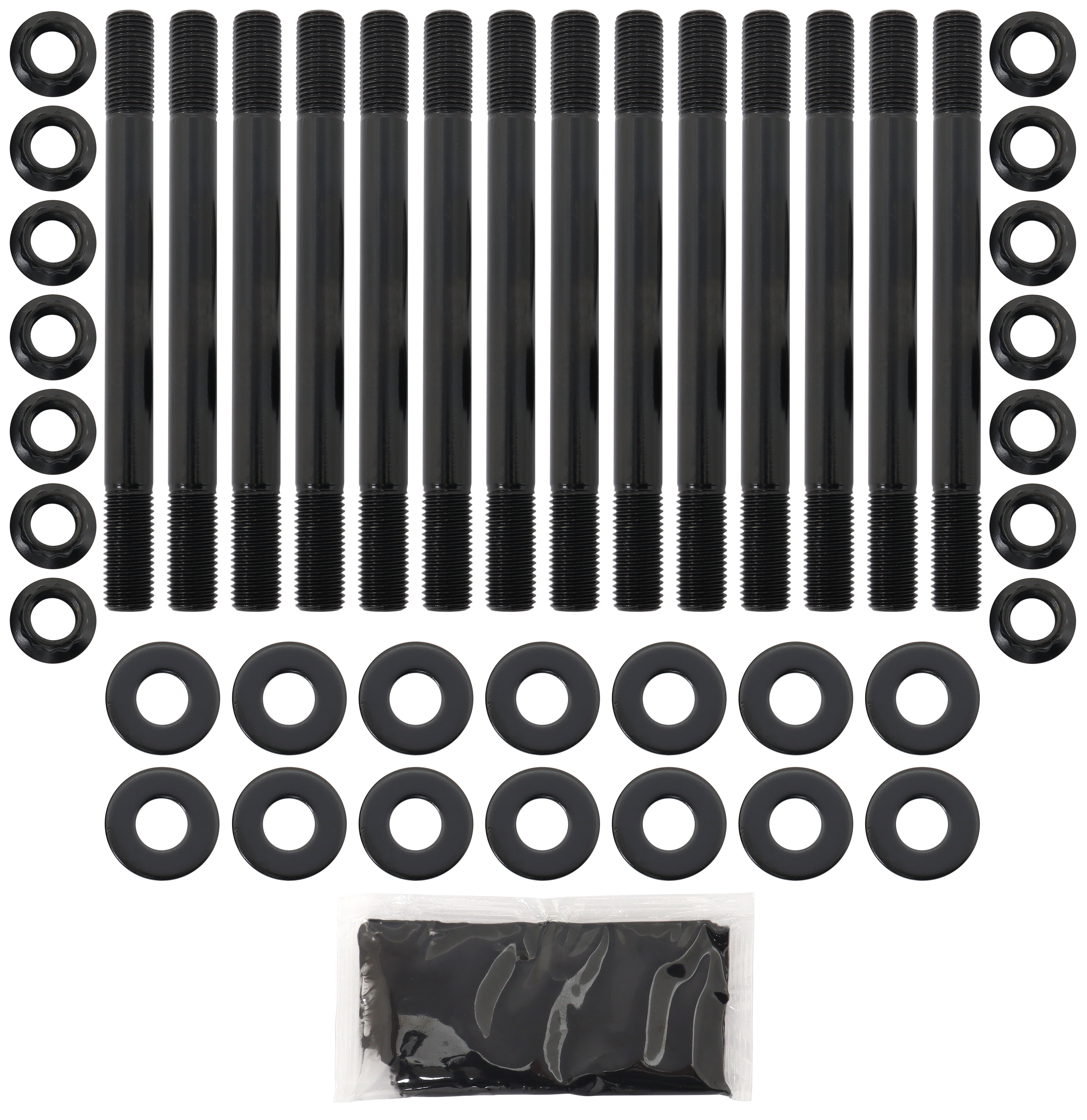 These head studs are manufactured from aircraftquality 8740 high tensile strength chromoly steel and cold-forged to ensure molecular integrity within thestud. Meaning these studs are rated up to 190,000 psi makingthem stronger than Grade 8 andOEM fasteners. All kits come complete with 12-point nuts and hardened washers for an even load distribution and accurate torque readings.