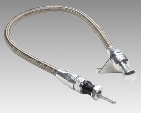 You have flexibility with our Teflon-lined Flexible Braided Stainless Transmission Dipstick. Kit comes complete with braided stainless outer housing and heat resistant E-Z to Read flexible inner dipstick measuring cable. Inner cable is molded with appropriate trans fluid levels. Billet aluminum handle and billet aluminum fittings complement Lokar’s Flexible Engine Dipsticks. Kit includes dipstick funnel adapter to assist in filling. Applications available for GM, Ford, and Chrysler in both firewall mount and Transmount. The firewall mount dipstick measures 24″ in length and is also available in 36″ and 48″ lengths.Transmount mounts to the bell housing and the length varies according to the transmission application.