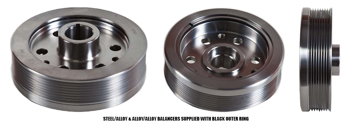 Steel Inner Hub / Steel Outer Ring, for Mild Street, Strip performance engines that offers increased harmonic absorption over stock units. 360 degreed outer rings. Similar weight to factory cast units but with the safety of an encapsulated outer ring. RPM range 8500. Available in External or Neutral balance. Weight from 3 to 5kg’s