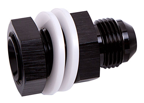 This Aeroflow Performance high flow bulkhead fitting is designed for use in fuel cells. They feature a radius on Inlet for unrestricted flow. Each bulkhead fitting includes 2 PTFE washers and a bulkhead nut. These fittings can also be used for adding a breather to a valve cover, or a drain on a fabricated tank whether it is a plastic or metal material.