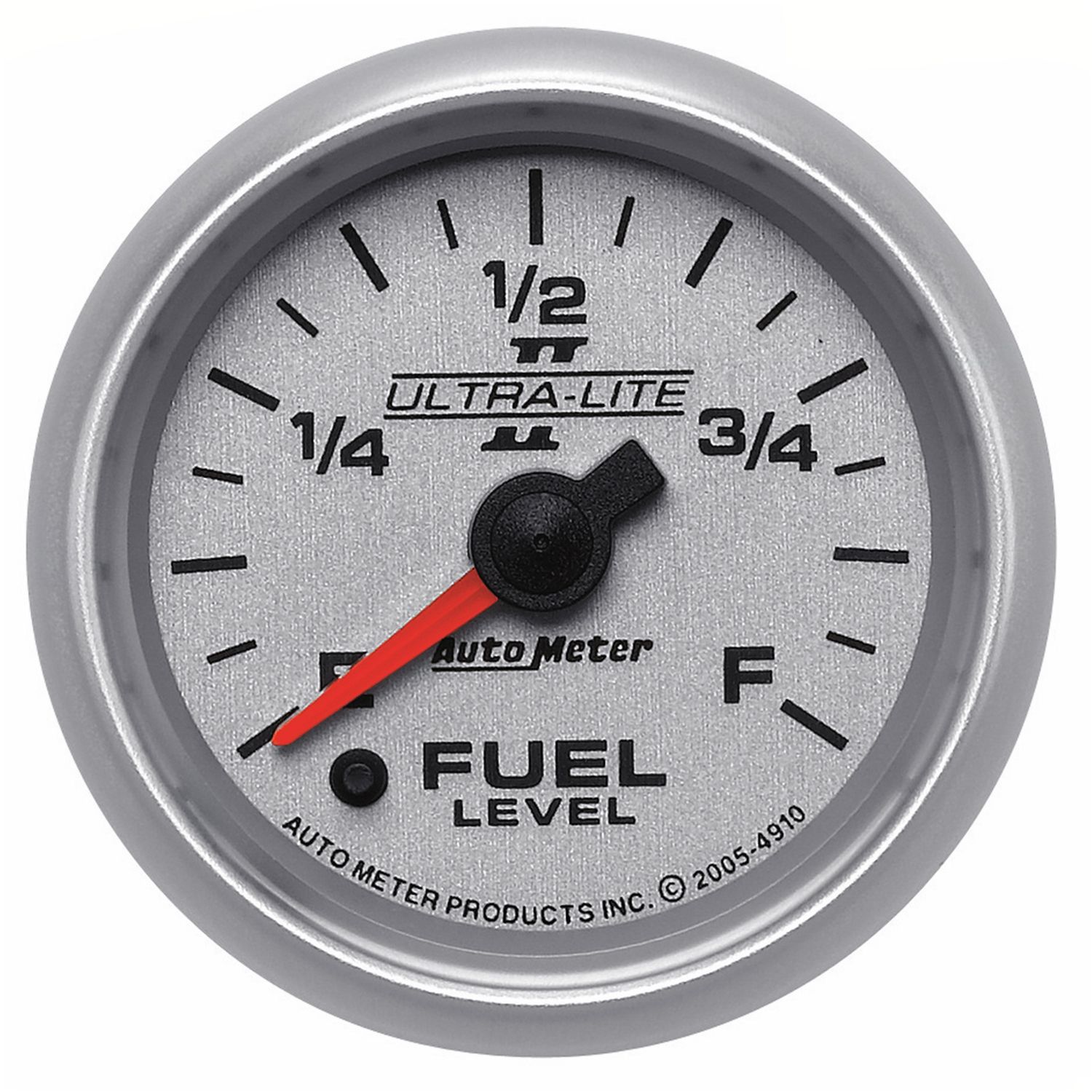 Auto Meter Ultra-Lite II Series Gauge features a silver face and black accents during the day, LED lit pointer, and through-the-dial lighting. At night, a reverse lighting effect features a dark dial with illuminated accents and pointer.