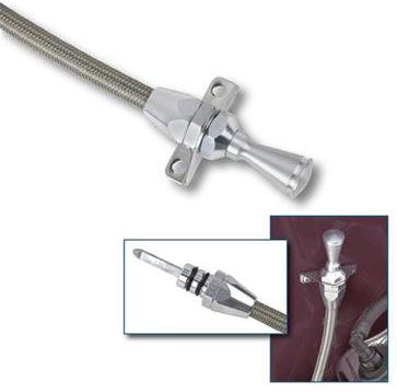 You have flexibility with our Teflon-lined Flexible Braided Stainless Transmission Dipstick. Kit comes complete with braided stainless outer housing and heat resistant E-Z to Read flexible inner dipstick measuring cable. Inner cable is molded with appropriate trans fluid levels. Billet aluminum handle and billet aluminum fittings complement Lokar’s Flexible Engine Dipsticks. Kit includes dipstick funnel adapter to assist in filling. Applications available for GM, Ford, and Chrysler in both firewall mount and Transmount. The firewall mount dipstick measures 24″ in length and is also available in 36″ and 48″ lengths.Transmount mounts to the bell housing and the length varies according to the transmission application.