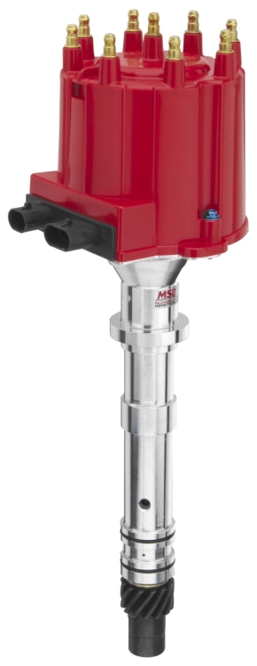 GM late-model performance enthusiasts will be happy to see this Pro-Billet Distributor. The distributor, PN 8366, is a drop-in replacement for GM V8s using the small cap distributor with a dual connector coil found in cars from 1987-1993 and trucks from 1987-1995. The entire housing is CNC-machined to exact tolerances for incredible strength (not to mention cool looks). For improved lubrication there is an extra oil tract machined into the bottom of the housing that delivers oil directly to the cam and distributor gears. Inside, a polished steel shaft receives guidance from a sealed ball bearing and an extra-long sintered bushing adds stability. This 0.500″ shaft also receives a QPQ coating for increased friction reduction and corrosion resistance. A factory style ignition module is supplied with the distributor so your factory wiring will plug directly in. Triggering this module is the responsibility of a high output magnetic pick-up. Topping it all off is a heavy-duty rotor and a red MSD cap with brass terminals to ensure full spark delivery. For late model engine swaps or bolt-on strength, this distributor is the answer.