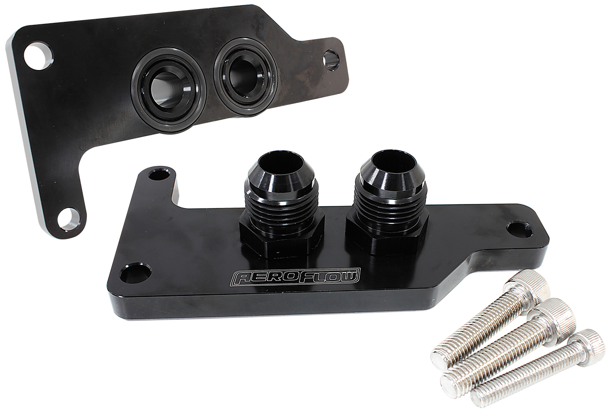 Aeroflow Performance offer this bolt-on slimline oil block adapter separately for the front or rear GM LS fabricated Aeroflow oil pans. This block features two -10ORBfemale threads with modified -10an male fittings facing straight down attached to a slimline plate that bolts to the Aeroflow LS series oil panAF82-2016 and AF82-2012.